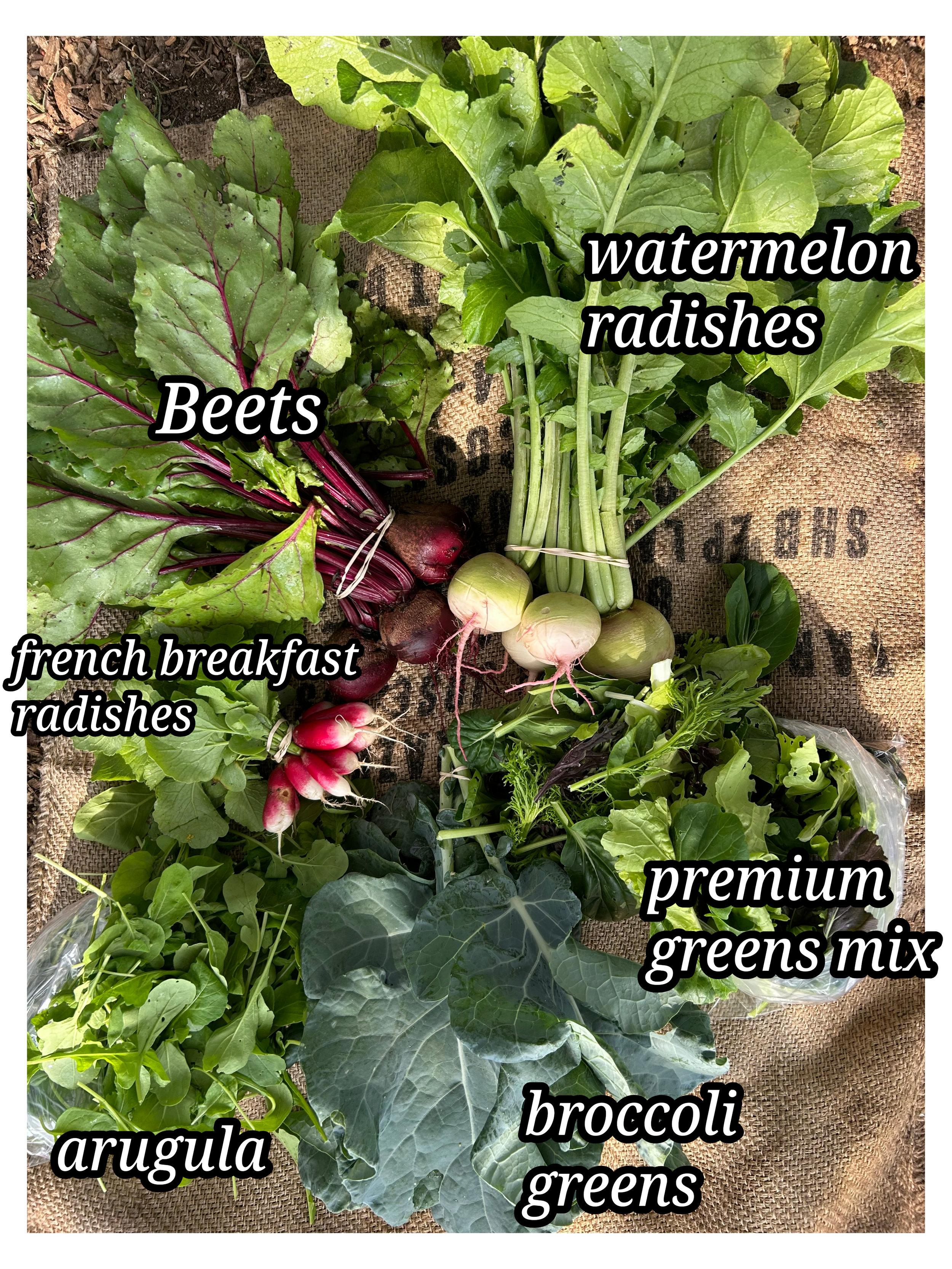 This week (11/20-11/23) we have premium greens mix (mustards, chinese cabbage, mizuna, tatsoi), arugula, french breakfast radishes, watermelon radishes, beets & broccoli greens.
